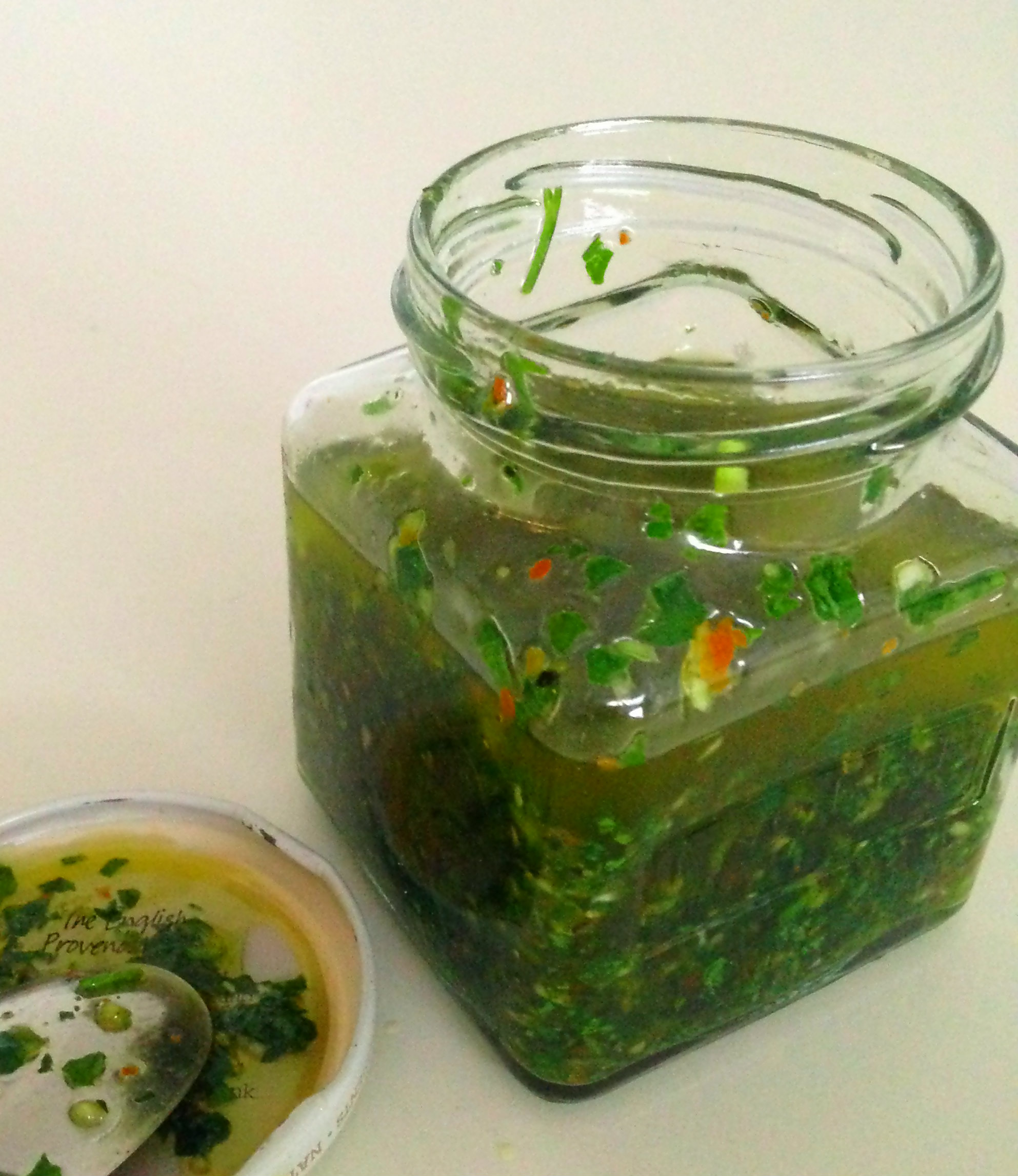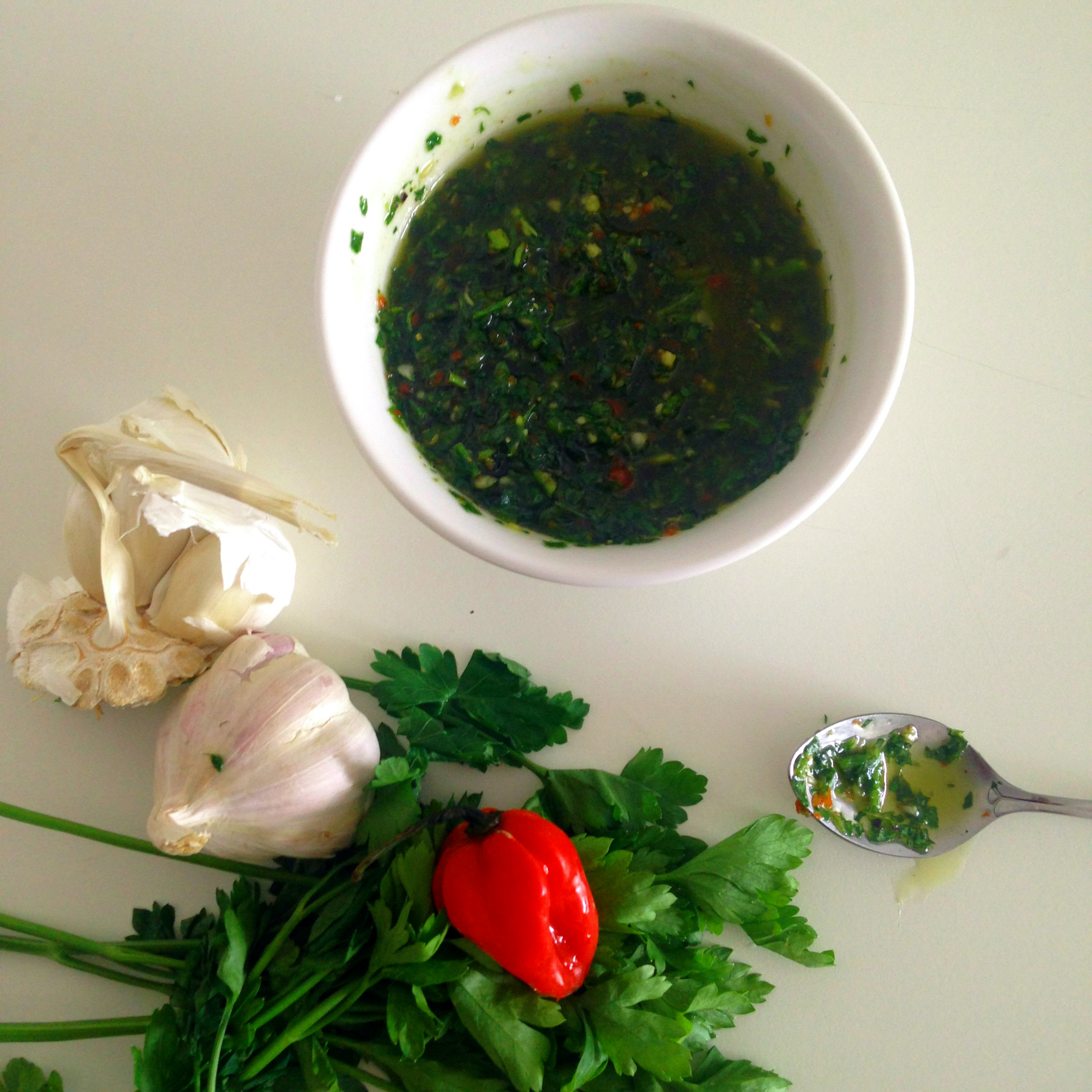 - Throw all the ingredients into a food processor and blitz. If you don’t have a food processor then chop up the parsley, garlic and scotch bonnet (be careful and wash your hands afterwards) finely and stir in with the oil and season.