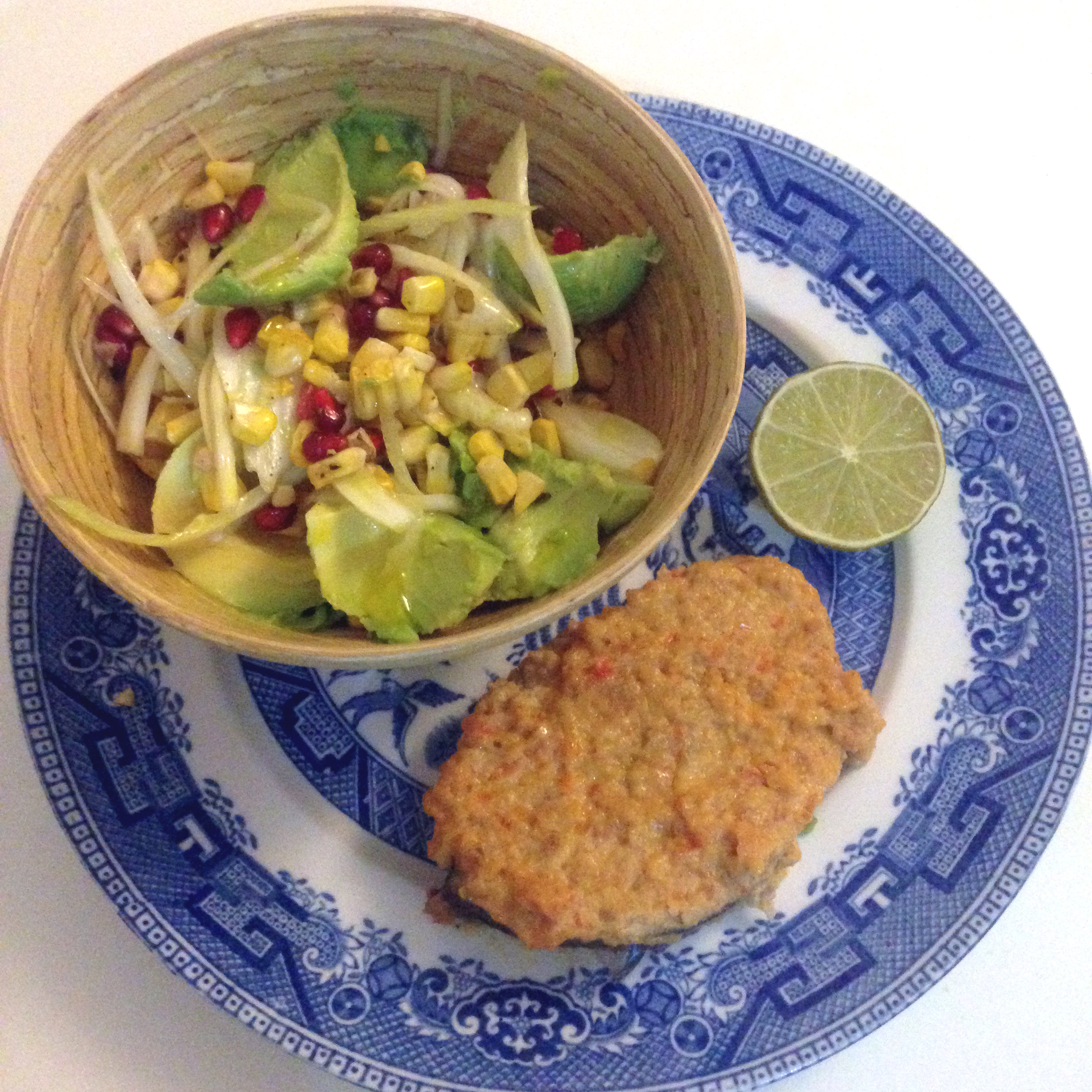 - While the fish and corn is cooking, prepare the other salad ingredient but wait until you are serving the dish to dress it with the lime juice and rapeseed oil.