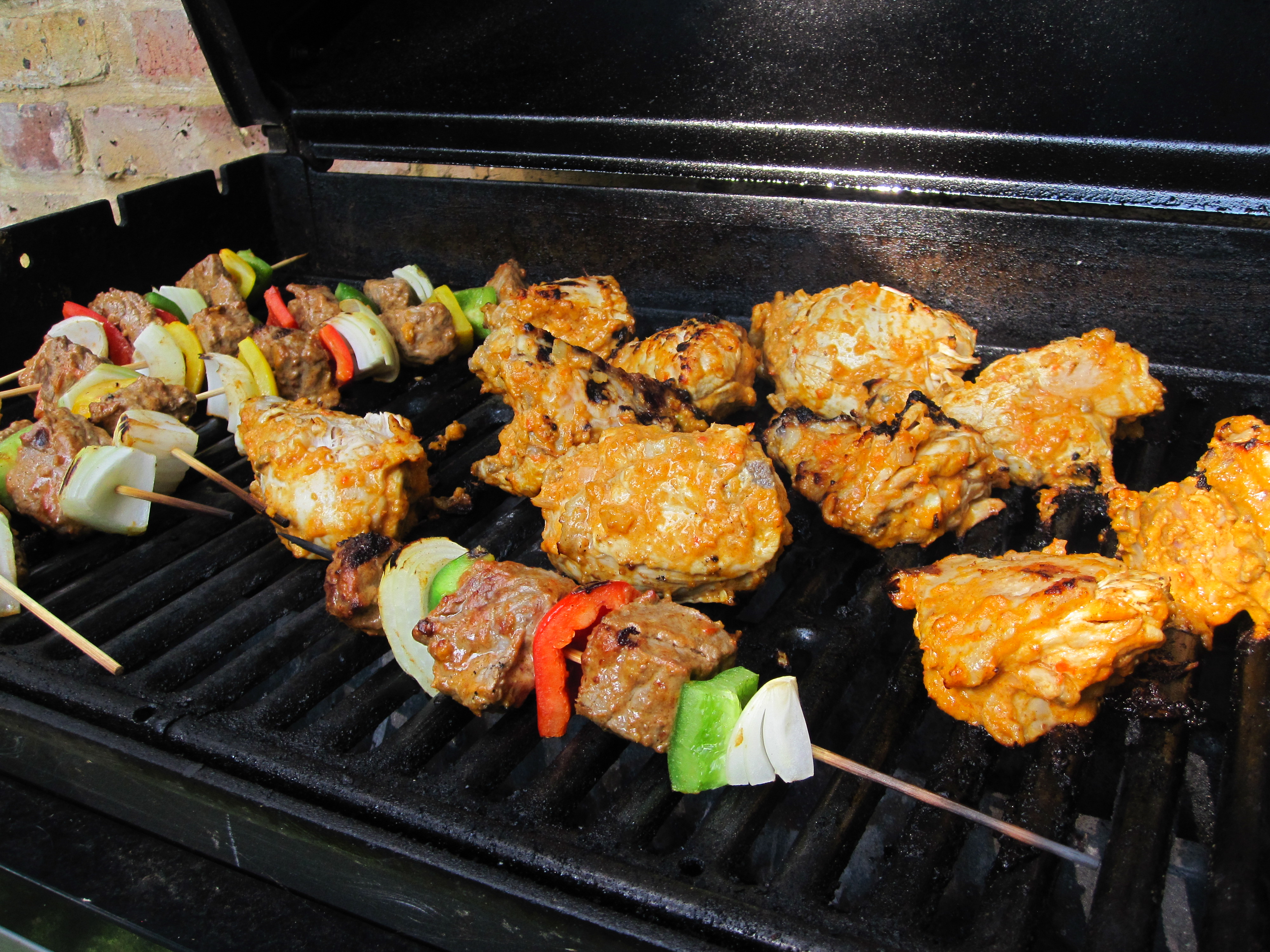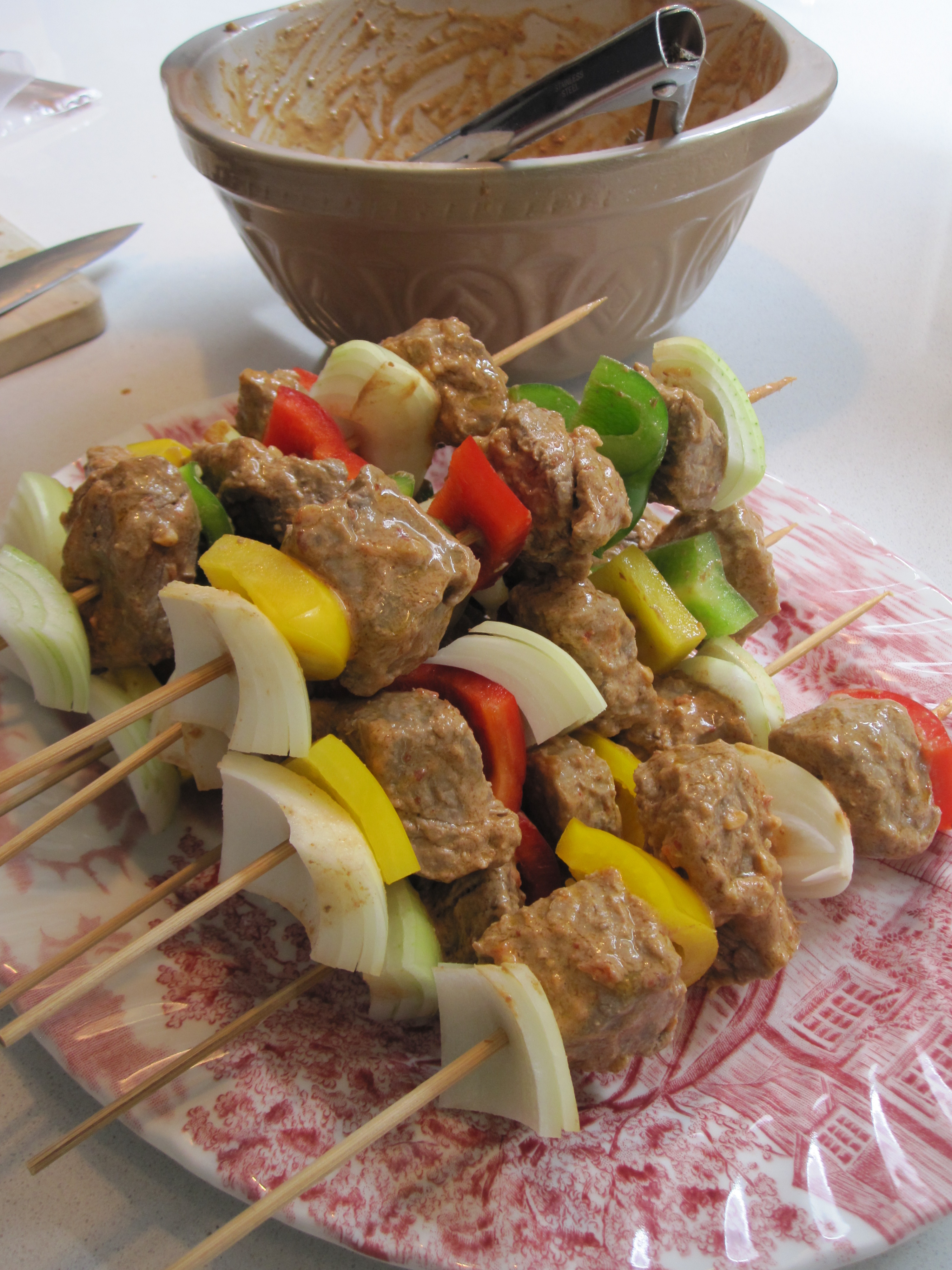 - Place about 3 – 4 pieces of the beef on the skewer, alternating with the onions and peppers in between each piece. Keep any remaining of the marinade to baste the meat on the barbecue when cooking.